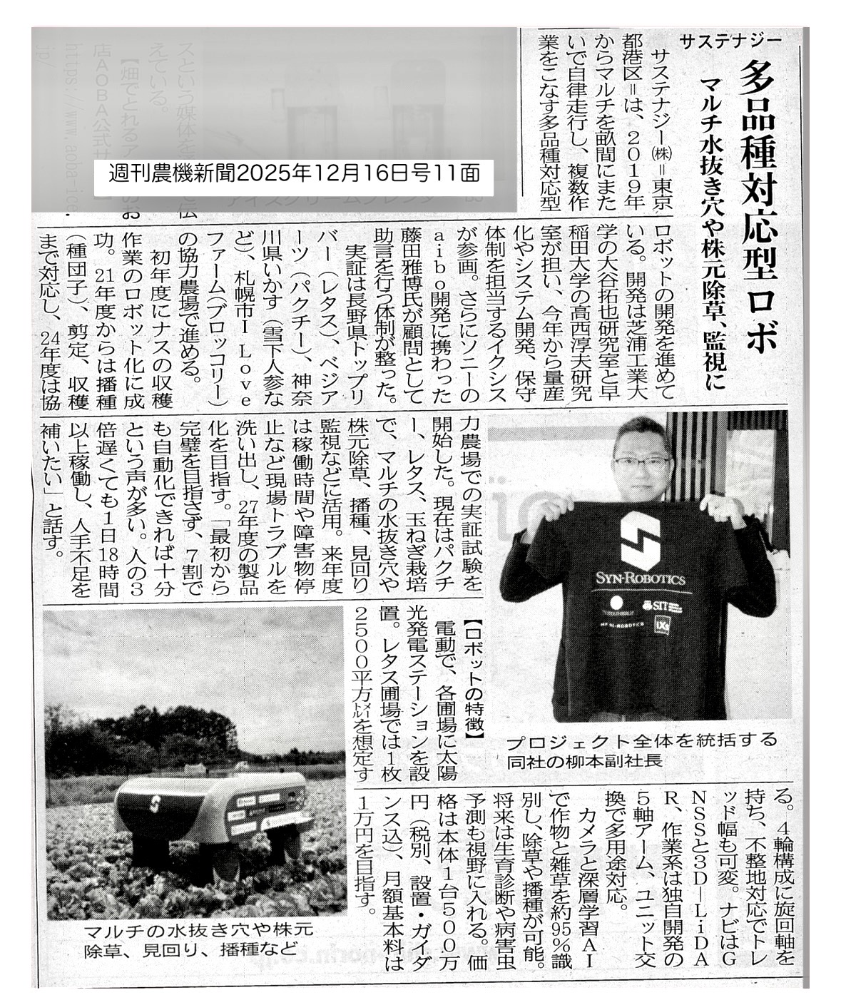 週刊農機新聞に、「SYN-ROBOTICS(シンロボ)」掲載されました!
