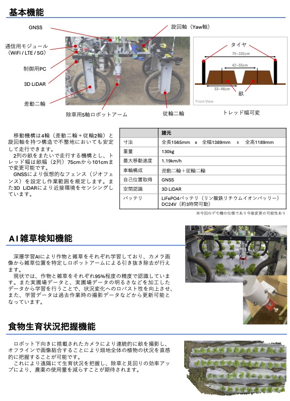 本試験では、AI画像解析と自律走行技術を用いた畝の走行、除草デモンストレーション、